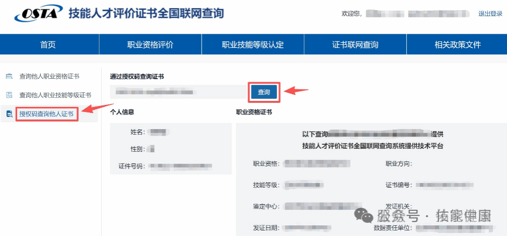 路径:左侧菜单栏→【查询他人证书】(或快捷查询框进入)。步骤:完整填写“证书编号、证件号码(身份证号)、姓名”,提交后显示查询结果(脱敏显示)。